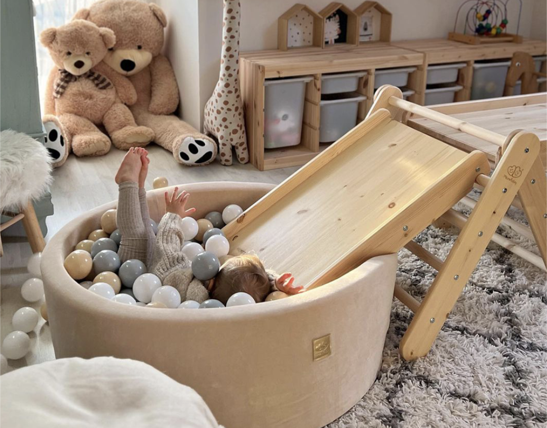 • Añade el tobogán 2 en 1 para más opciones de juego: un lado para deslizar y el otro, con agarres de madera, para escalar.