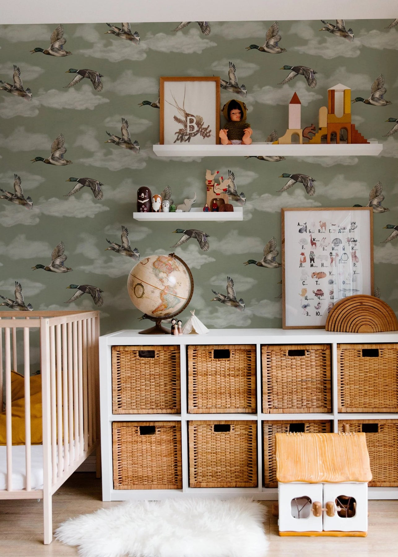Apportez à vos murs une ambiance apaisante, inspirée de la nature : des canards colverts en plein vol parmi de doux nuages. Une illustration délicate qui insuffle mouvement et sérénité à chaque pièce, disponible en quatre coloris élégants.