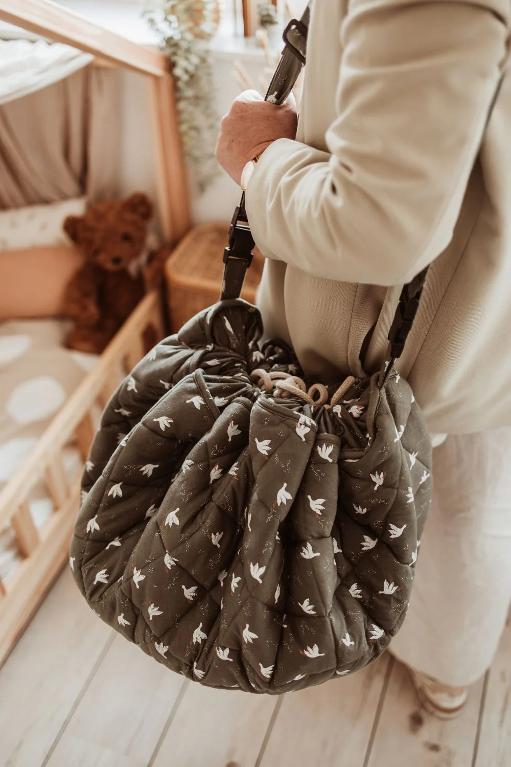 Karın zamanından toplama anına kadar, GOTS sertifikalı organik pamuklu bu 3’ü 1 arada bebek oyun matı, oyuncak depolama çantasına ve bebek bezi çantasına dönüşür; günlük kolaylığı, eğlenceli desenli stiliyle kreş için ya da yolda mükemmel bir uyum yakalar.